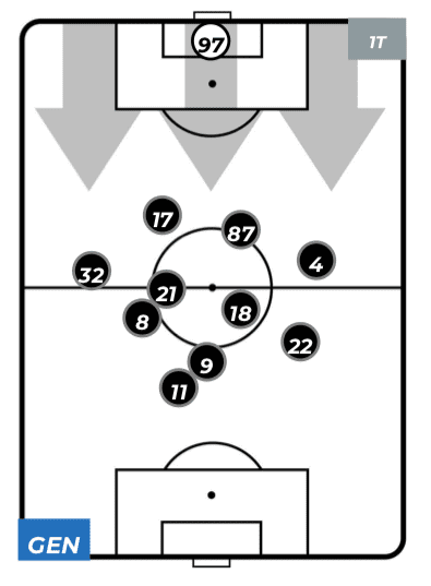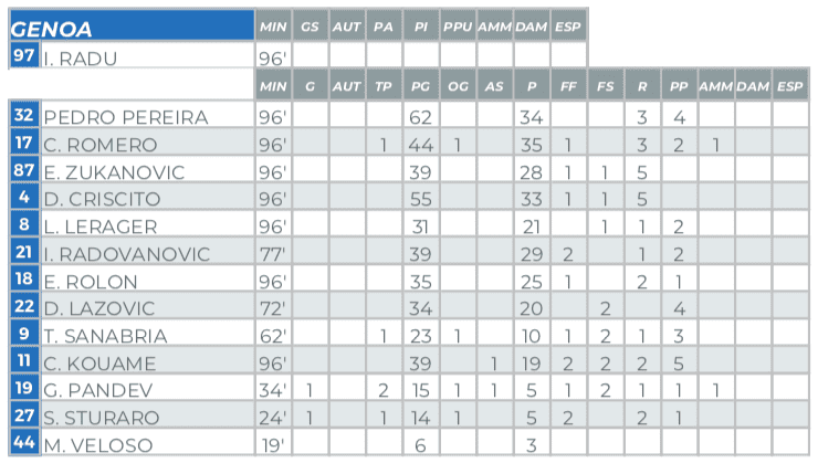 Il naufragio bianconero, il primo di una lunga stagione di imbattibilità e successi, è direttamente proporzionale alla forza di volontà messa in campo dal Genoa, spinto da un pubblico eccezionale e ridisegnato con Kouamè e Sanabria molto vicini e disponibili a scambiarsi frequentemente di posizione. A dire il vero, riguardando anche le statistiche e le posizioni medie dei calciatori, la prima punta lanciata nello spazio è stata prevalentemente l’attaccante ivoriano, che non a caso è tornato ad essere il primo tra i rossoblu nello sprint (1,2 km su 11,5 totali).