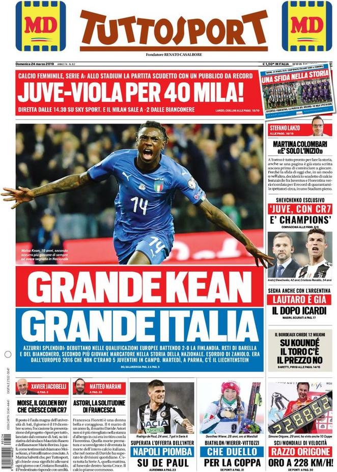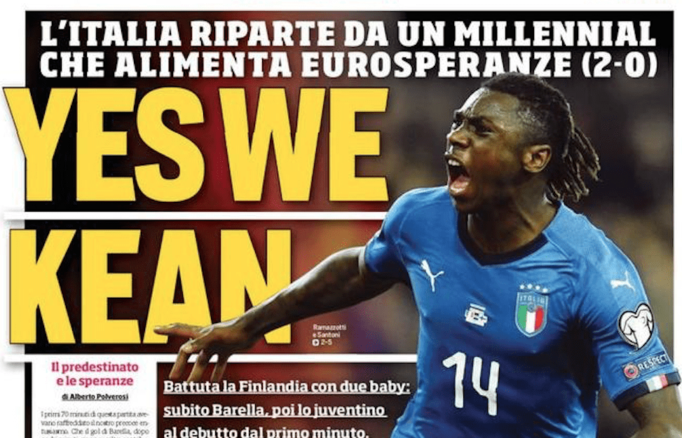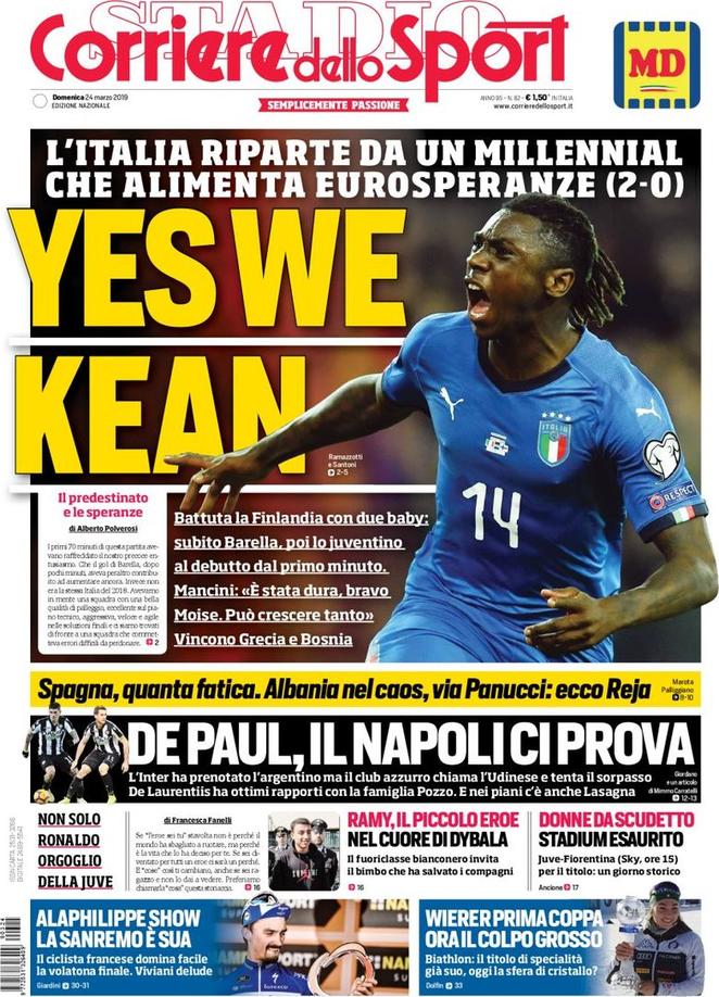 L’Italia vince nella prima gara del girone di qualificazione ai prossimi campionati europei. Stende la Finlandia a Udine grazie alle reti di Barella e del giovanissimo Moise Kean, lodato ed esaltato dalla critica e sulle prime pagine dei quotidiani sportivi nazionali. In Albania esonerato il ct Christian Panucci, che aveva sostituito Gianni De Biasi ed il cui successore dovrebbe essere Edy Reja. Da un italiano a un italiano, e così via.