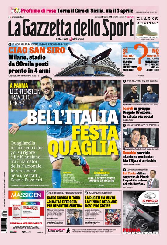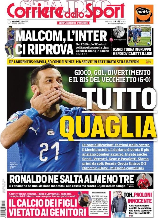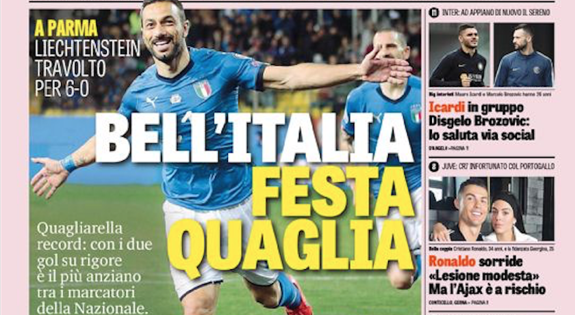 Fabio Quagliarella fa record anche in Nazionale: dopo la doppietta messa a segno contro il Liechtenstein, ora è lui il giocatore più anziano ad aver segnato con la maglia dell’Italia. Gli Azzurri di Roberto Mancini si godono la maxi-vittoria ed il punteggio pieno nel girone, anche se il difficile deve ancora venire: Bosnia e Grecia sono infatti alle porte.
