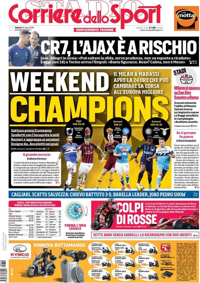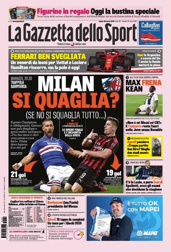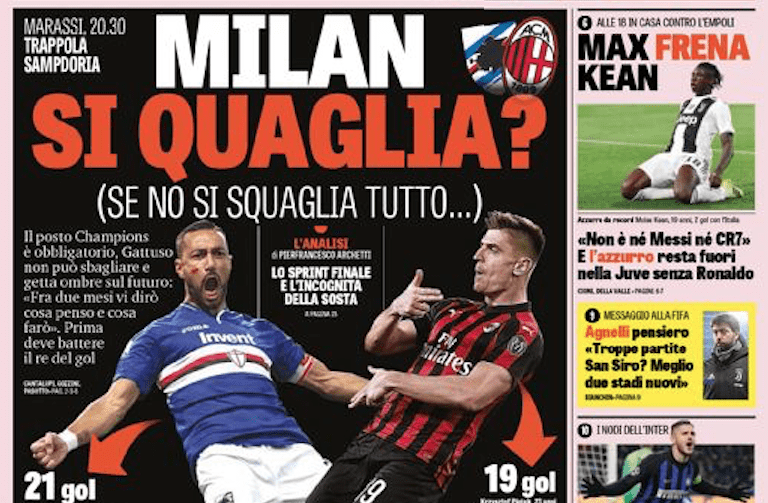 Samp-Milan, Roma-Napoli ed Inter-Lazio: tre sfide per spostare qualche pedina fra la zona Champions e quella valida per un posto in Europa League. De Ligt, intervistato da Tuttosport, conferma l’interesse da parte della Juventus ma frena: “Il mio futuro lo decide Mino Raiola”. Spalletti deciderà invece le sorti di Mauro Icardi, tornato in gruppo e pronto ad essere utilizzato, vista anche l’assenza forzata di Lautaro. Chance per Keita Balde? Quella delle 20.30 sarà la sfida tra Quagliarella e il pistolero Piatek, fino a qualche mese fa con la maglia del Genoa. Nell’ultimo scontro fra titani del gol, ovvero il derby di andata fra Genoa e Sampdoria, a segnare furono entrambi.