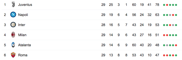 Apertasi all’ora di pranzo con la vittoria dell’Atalanta al Tardini di Parma, che ha permesso agli uomini di Gasperini di portarsi a -3 punti dalla zona Champions, la domenica di Serie A prosegue con il match dell’Olimpico tra Roma e Napoli, e le gare Fiorentina–Torino e Frosinone–SPAL. Dopo la partita delle 18 tra Bologna e Sassuolo, a chiudere questa 29esima giornata di campionato, la decima del girone di ritorno, sarà il posticipo del Meazza che vedrà in campo Inter, ancora senza Icardi (non convocato, ndr), e Lazio.