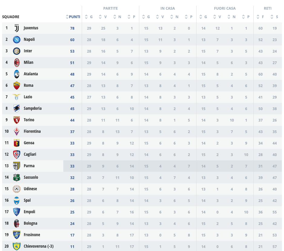 La formazione di Gian Piero Gasperini, congedatasi con un pareggio casalingo contro il Chievo, ritrova immediatamente l’appuntamento coi tre punti e scala una classifica che, complice la sconfitta di Milan, accorcia la classifica anche per il quarto posto valido per la Champions League. L’Atalanta, ferma a 48 punti, dista adesso tre lunghezze dai rossoneri e ritrova anche il suo bomber, Zapata, il calciatore ad aver segnato più reti in trasferta in questa Serie A (13) e, soprattutto, più reti su azione (18 su 19). Su diciannove centri, solamente uno arrivato dal dischetto. Agguantati nella classifica marcatori Piatek e Ronaldo.