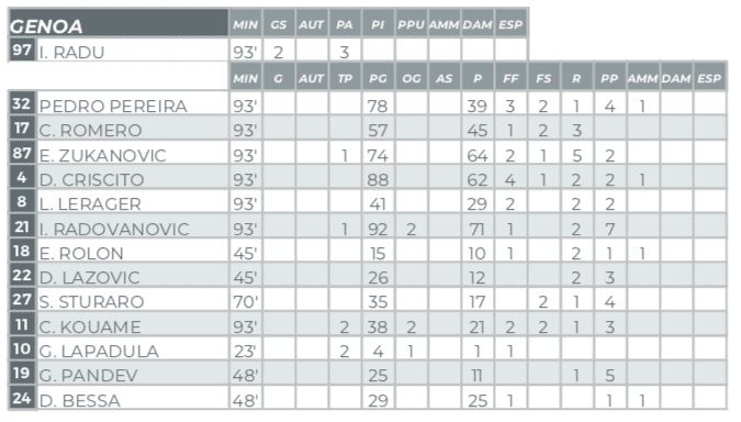 Sono tutti dati su cui riflettere. Perché se fioccano le insufficienze in casa Genoa, molti rossoblu hanno provato a mascherare la loro partita con dati ben superiori alle loro medie stagionali. Specialmente nella precisione dei passaggi oppure nei palloni recuperati, a