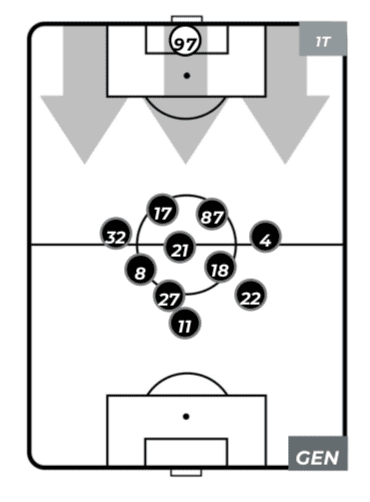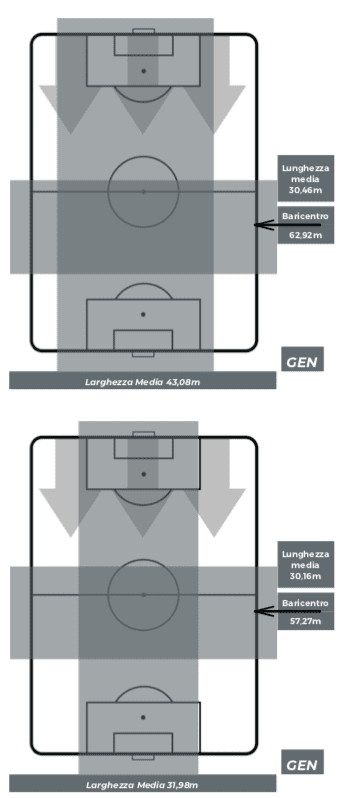 Ce lo racconta anzitutto una partita dai ritmi più blandi del solito in Serie A. Nessun giocatore, né da una parte né dall’altra, ha superato gli undici chilometri percorsi. Mandragora risulta il migliore con 10,8 chilometri. Un dato interessante perché evidenzia una sfida giocata più che sull’intensità sugli errori dell’avversario. Poi c’è il dato sul baricentro medio delle due squadre e sullo sterile comando del gioco da parte del Genoa: l’Udinese ha infatti stazionato per quasi tutta la gara dietro la linea del pallone, come raccontano i suoi 44 metri di altezza del baricentro. Praticamente mai oltre il cerchio di centrocampo, sempre corta in 30/35 metri.