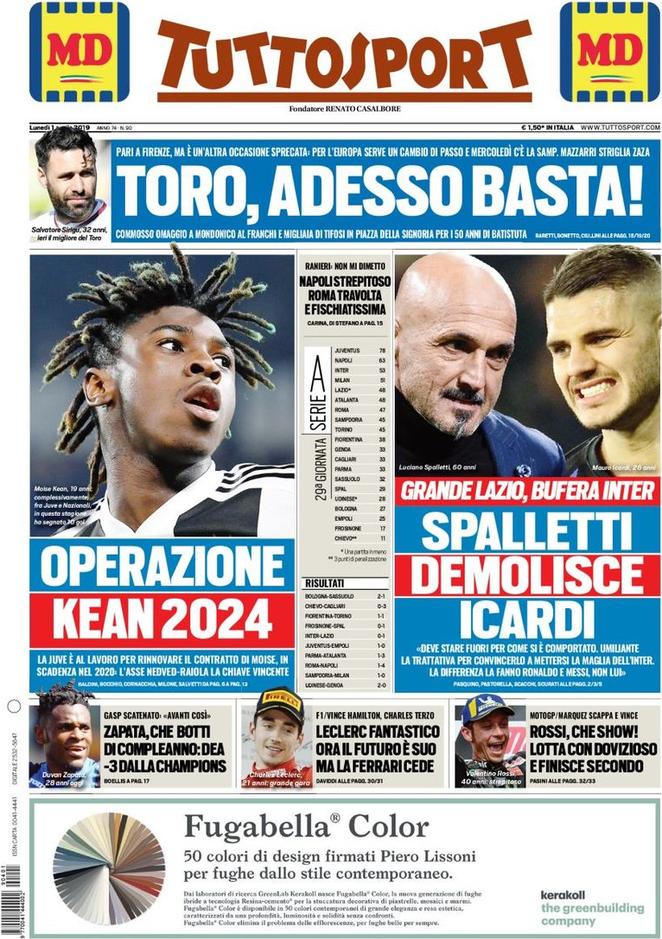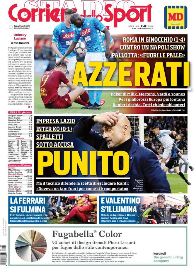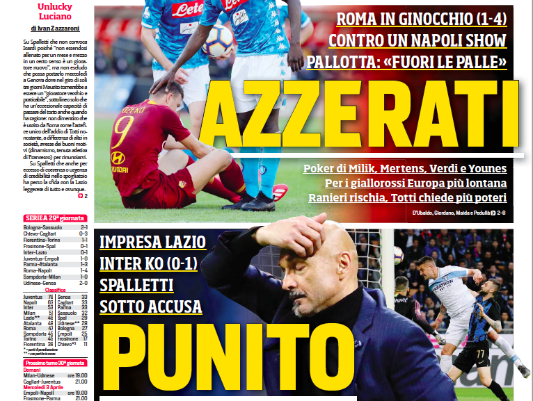 Oggi le prime pagine sono tutte per il tracollo casalingo della Roma, sconfitta per 4-1 dal Napoli, e per la sconfitta dell’Inter contro la Lazio, che nel dopo gara ha scritto un nuovo capitolo, sempre più retorico e sempre meno calcistico, tra Spalletti e Icardi. “La differenza la fanno Messi e Ronaldo, non lui. Umiliante la trattativa per portarlo a rivestire la maglia dell’Inter“. C’è spazio anche per il possibile rinnovo di Moise Kean con la Juventus e per la vittoria dell’Atalanta col Parma che proietta gli orobici a -3 dalla Champions League.