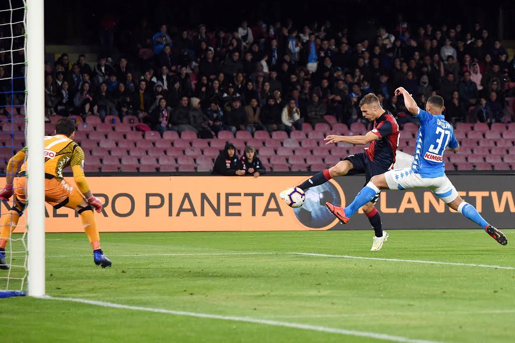 Il Genoa giocherà un’ora di gara in dieci uomini, ma non modifica la sua volontà di cercare di aggredire l’avversaria, provandoci al 32esimo con Kouamè che prima conquista angolo su deviazione di Karnezis, poi di testa su calcio d’angolo. Al 33esimo, però, chi passa in vantaggio è il Napoli con Mertens e un suo destro dai 25 metri che batte Radu.