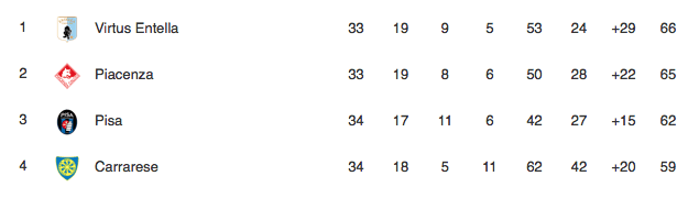 LA CLASSIFICA – Si complica e non poco la corsa dell’Entella per un posto in Serie B senza dover passare dalla ghigliottina dei playoff. Tutto resta nelle mani dei ragazzi di Boscaglia, ora avvicinati in classifica dal Piacenza (vittorioso in casa contro il Cuneo) che rimane ad un solo punto di distanza. Il prossimo turno la Virtus affronta l’Arezzo, poi sarà scontro diretto proprio contro i lupi al Garilli.