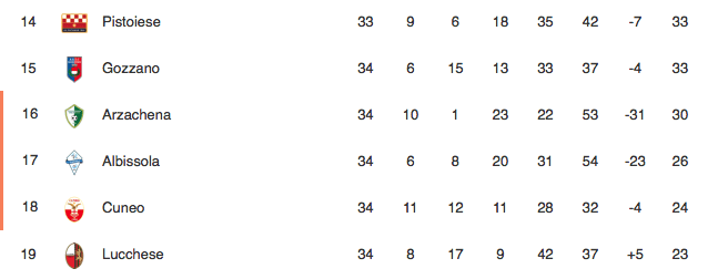 LA CLASSIFICA – La vittoria sul Siena sesto della classe ha portato l’Albissola di Rino Lavezzini al quartultimo posto in piena zona play-out, complici il pareggio della Lucchese al Silvio Piola contro la Pro Vercelli e la sconfitta del Cuneo maturata in casa del Piacenza.