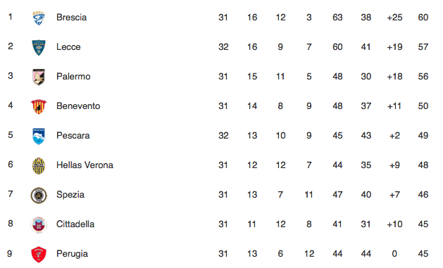 Lo Spezia si conferma così squadra in viva ed salute, al pari di Cittadella e Perugia, tenendo viva la lotta a sei per i cinque posti che valgono i playoff. Una fra Palermo, Lecce e Brescia, dovrà accontentarsi del terzo gradino del podio. Tutto resta aperto, il divario minimo fra la quarta e la nona piazza (solamente cinque punti) non permette di alzare la testa per guardarsi intorno. Piange il Benevento, che manca l’appuntamento con il riscatto e cade contro i rosanero. Non basta la rete del genoano Raul Asencio nel finale.
