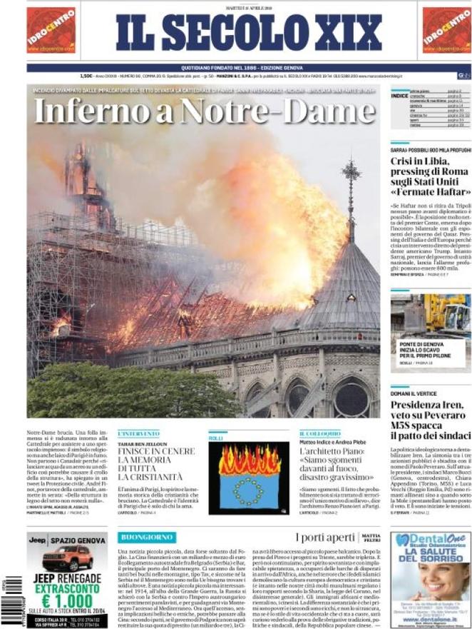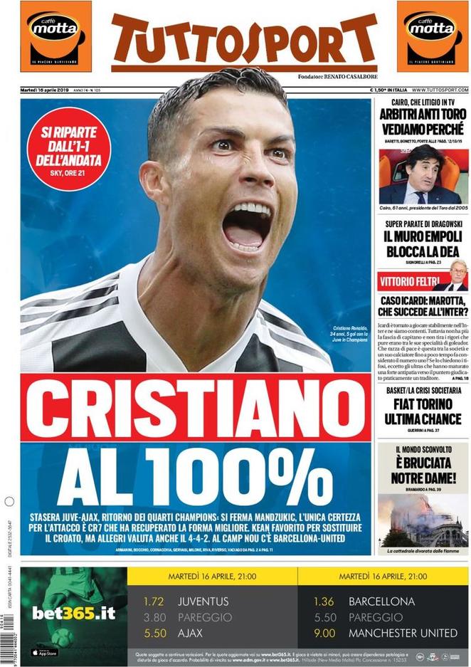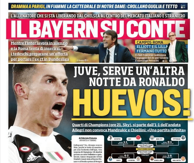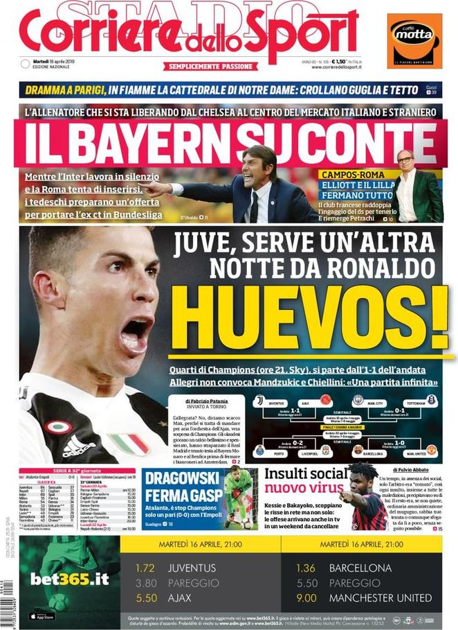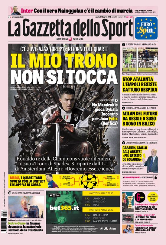 Anche le prime pagine dei principali quotidiani sportivi dedicano uno spazio al tragico incendio che ha devastato la cattedrale di Notre-Dame a Parigi. Questa sera torna la Champions League, con la Juventus chiamata a vincere e convincere a Torino di fronte ai gioielli dell’Ajax ed il Barcellona impegnato a proteggere il vantaggio conquistato a Manchester contro lo United. Il Bayern pensa a Conte, Dragowski ferma la corsa dell’Atalanta e tiene vive le speranze di salvezza dell’Empoli.