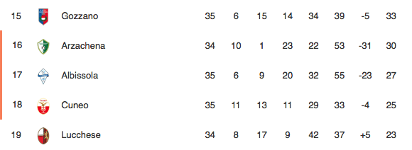LA CLASSIFICA – In attesa di Lucchese-Piacenza, Rino Lavezzini si prepara ad affrontare proprio l’ultima della classe nel prossimo turno, il penultimo del campionato. Una rimonta che consenta al Cuneo di evitare i playout resta particolarmente improbabile, a maggior ragione in vista di un’imminente ulteriore penalizzazione, ma l’aritmetica lascia spazio alla speranza. E con lei i recenti risultati, positivi e combattuti fino al 90′ da una parte e dall’altra del campo. A volte sei tu che mangi l’orso, a volte è l’orso che mangia te. E l’Albissola, per il momento salva, può crederci.