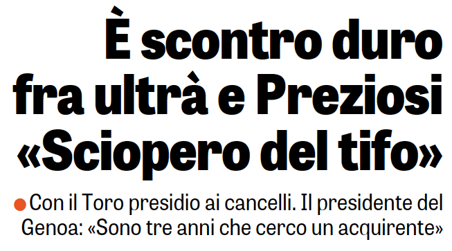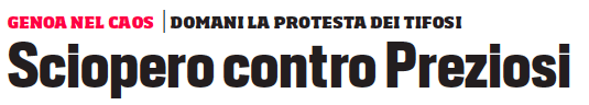 CORRIERE DELLO SPORT – Dopo giorni di anonimato, anche il Corriere dello Sport si ricorda del Genoa in virtù della contestazione al presidente Preziosi, che riprenderà a partire da domani, quando i rossoblu sfideranno il Torino al Ferraris. Il titolo scelto per il breve spazio dedicato al Genoa è “sciopero contro Preziosi”.