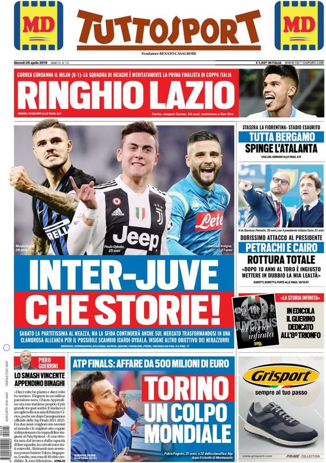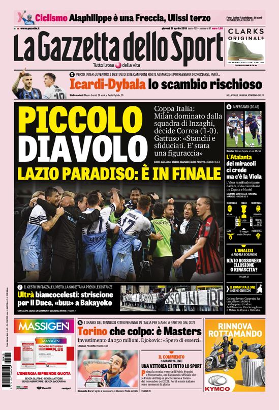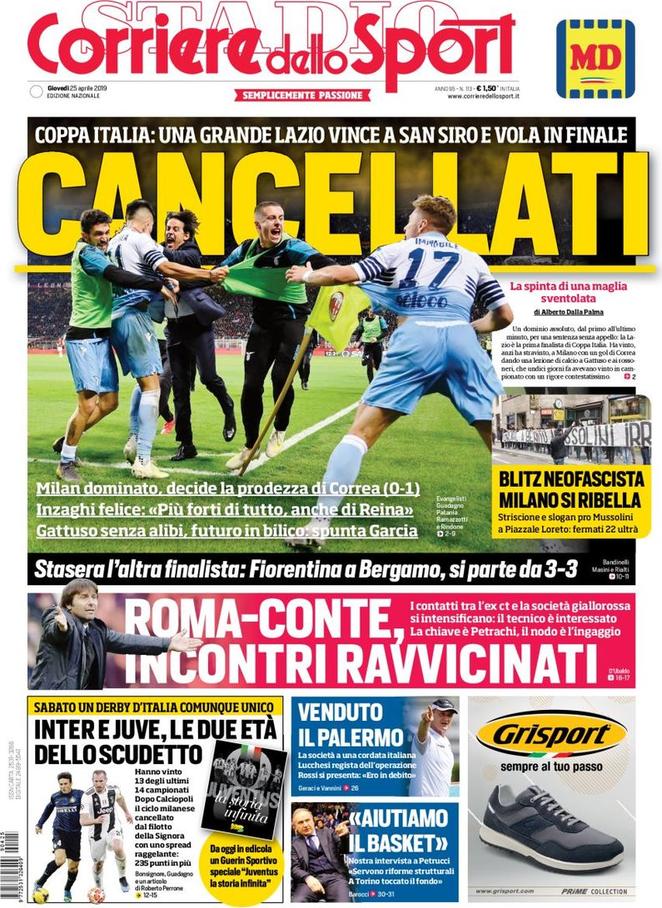 La Lazio fa secco il Milan a San Siro e va in finale di Coppa Italia. Questa sera tocca a Fiorentina ed Atalanta rispondere: a Bergamo si attende il tutto esaurito. La Juventus pianifica il futuro, cerca di rinforzare la difesa e viene accostata persino al nome di Gian Piero Gasperini in vista della prossima stagione. Conte chiamato dalla Roma, Sarri punito dalla Football Association, Delio Rossi di ritorno a Palermo nel giorno in cui viene annunciata la cessione del club ad una cordata italiana. Lucchesi ed Arkus Network sarebbero al centro dell’operazione che porterà grandi cambiamenti nel club siciliano.