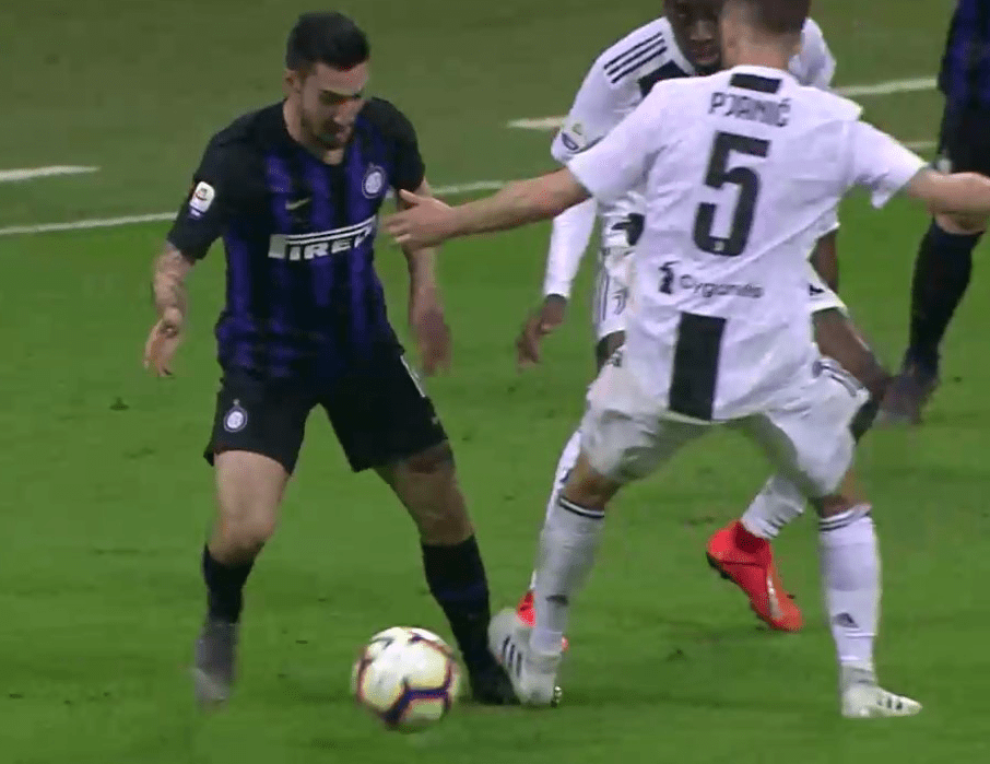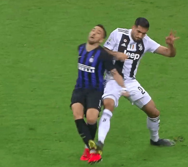 Nella sfida di San Siro, né Pjanic (su Politano) né Emre Can (su Vecino) verranno ammoniti per gli interventi di cui le immagini sottostanti documentano la dinamica. Se quello di Pjanic è meno grave, come intervento, rispetto a precedenti dove meritava quantomeno un cartellino “arancione” per il piede a martello, l’irruenza di Emre Can a palla lontana avrebbe probabilmente meritato qualcosa in più di una semplice ramanzina arbitrale. Banti non interverrà in nessuna delle due occasioni, così come il VAR Mazzoleni. Impossibile che non tornino in mente i rossi diretti a Criscito e Sturaro, confermati quando non suggeriti dalla tecnologia.