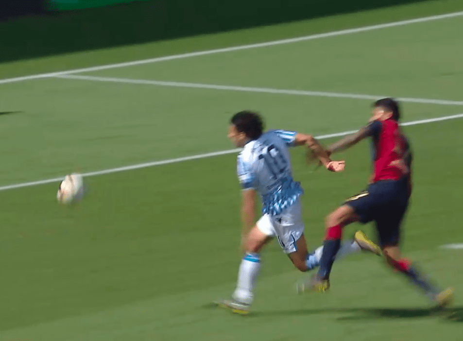 Arriviamo quindi al secondo episodio, il presunto fallo di Romero su Floccari nel secondo tempo. Già in cronaca testuale scrivevamo che non c’era nulla, ma le immagini confortano questa tesi. Floccari sfugge alla marcatura di Romero, ma il difensore argentino rimedia e viene a contatto con l’attaccante spallino soltanto sfiorandolo con braccio sinistro (la gamba sinistra trae in inganno, ma un contatto non c’è). Il dopo è noto: l’attaccante ex Genoa cade con estrema facilità dopo essersi allungato il pallone, perdendolo dalla propria disponibilità. Floccari protesterà, ma neppure con troppa veemenza. Qualche recriminazione arriverà nel dopogara, ma senza particolari strascichi.