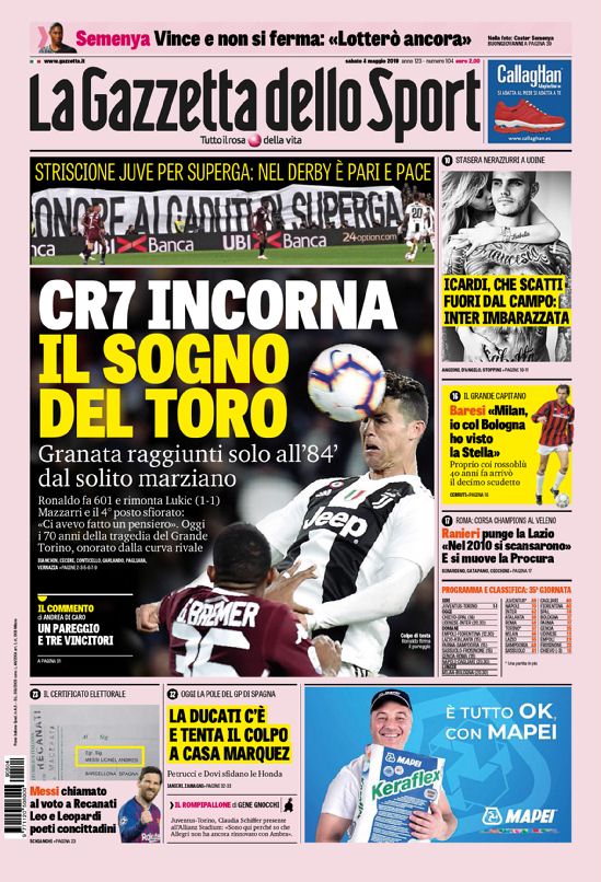 La Procura Federale si muove dopo la risposta di Ranieri in merito a Lazio-Inter del 2010. Spalletti commenta le foto di Mauro Icardi e Wanda Nara comparse sui social, Leo Messi ha residenza a Recanati come Giacomo Leopardi. Uno striscione da parte dei tifosi della Juventus per i caduti a Superga (70 anni dopo la tragedia) sancisce la pace in un derby terminato sul punteggio di parità. Lukic illude Mazzarri, poi arriva Cristiano Ronaldo.