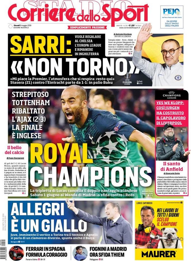 Le prime pagine dei quotidiani sportivi nazionali si barcamenano fra l’impresa del Tottenham contro l’Ajax, la querelle Conte-Allegri per le panchine di Juventus e Inter ma, non in ultimo, la questione relativa allo stadio di San Siro, sicuro ma pericolante. All’Inter si propone Alexis Sanchez, Di Francesco sondato dal Milan, Chelsea nel mirino della FIFA per un altro blocco del calciomercato.