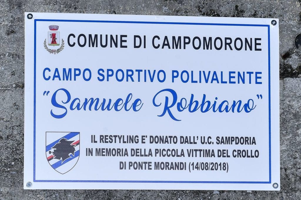 Giovedì 9 maggio, presso Campomorone, vi è stata la cerimonia di intitolazione del campo sportivo polivalente dei giardini Dossetti a Samuele Robbiano, il più piccolo a perdere la vita nel tragico crollo di Ponte Morandi lo scorso 14 agosto. Il campo è stato recentemente restaurato con la collaborazione della Sampdoria “per volere della società del presidente Massimo Ferrero su indicazione del giornalista di Sky Alessandro Alciato”, si legge in una nota stampa pubblicata sui canali ufficiali blucerchiati.