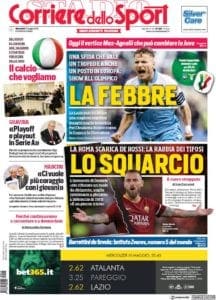 Questa sera la finale di Coppa Italia fra Lazio ed Atalanta. Gravina propone: “Playoff e playout anche in Serie A”. De Rossi lascia la Roma 18 anni dopo il suo esordio in maglia giallorossa, l’incontro Allegri-Agnelli sembra poter dare esito positivo. Secondo la Gazzetta dello Sport a breve Sarri saluterà il Chelsea: occasione Roma o tentazione Milan?