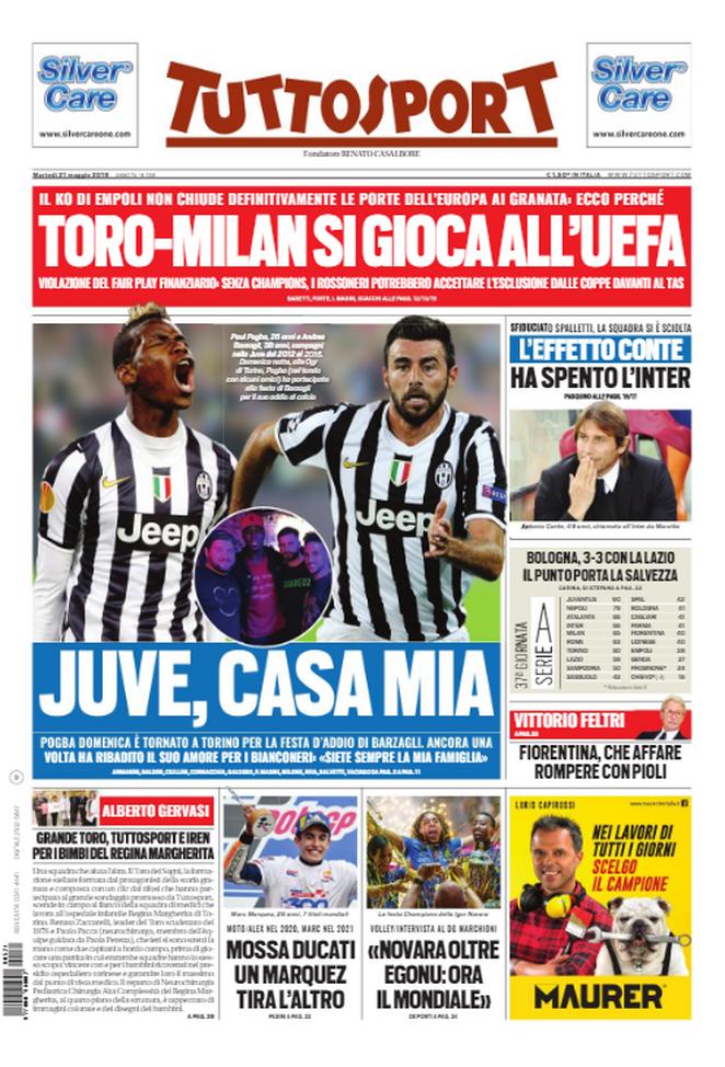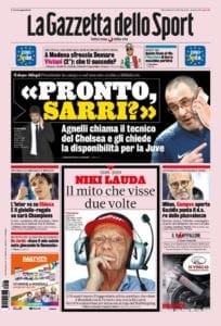 Agnelli chiama Sarri per chiedere la disponibilità ad un passaggio alla Juventus, il Torino spera ancora nell’Europa League qualora il Milan venisse escluso dalle coppe. L’Inter chiude per Conte ma deve blindare la Champions per assicurarsi anche il talento della Fiorentina Chiesa, nel frattempo El Shaarawy rifiuta il rinnovo di contratto propostogli dalla Roma. Le prime pagine di Corriere e Gazzetta dedicano ampio spazio alla morte di Niki Lauda, “l’uomo che visse due volte e vide in faccia la morte”.