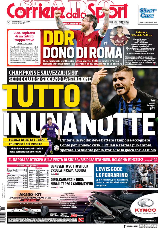 CORRIERE DELLO SPORT – Tutto dipende da Milano, dove Andreazzoli sfiderà l’amico e conterraneo Spalletti in una gara decisiva per la Champions League e la salvezza. Al Franchi di Firenze Prandelli sfida i Della Valle, pronti alla cessione ad un fondo americano. Il tecnico del Genoa non ha fortuna con i presidenti: “Preziosi gli ha venduto Piatek a gennaio e la squadra si è ripiegata su se stessa”. Se perde, la sua squadra è retrocessa in Serie B a prescindere dal risultato di Inter-Empoli.