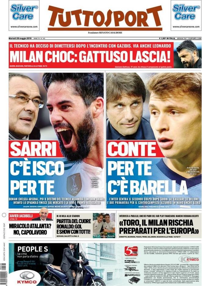 Le prime pagine di giornata sono interamente per il futuro in panchina delle big italiane. Sarri continua ad essere accostato alla Juventus (e con lui Isco del Real Madrid, ndr), Conte giovedì sarà alla Pinetina, Gasperini attende l’incontro con Percassi e continua ad essere tallonato dalla Roma. Gattuso intanto è pronto a dire addio al Milan.