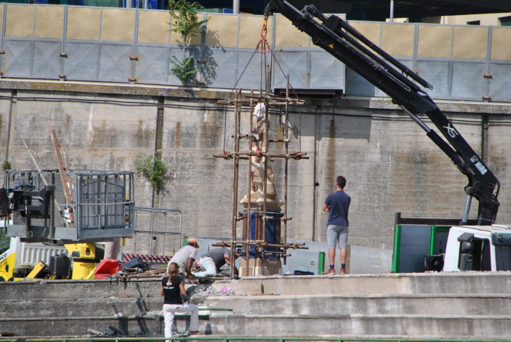 PATRIMONIO ARTISTICO DA TUTELARE – Le statue presenti a Villa Rostan sono patrimonio del Ministero dei Beni Culturali e quindi vanno tutelate da vicino in questi giorni dalla Sovrintendenza, presente a Pegli assieme agli operai. La rimozione di ogni singola statua impegna una minigru e porta via una giornata intera vista la delicatezza e l’attenzione dell’operazione. Oggi toccava a quella centrale della tribuna, oggi l’unico baluardo di un centro sportivo che sta mutando forma e che a breve vedrà aprire i primi cantieri di lavoro.