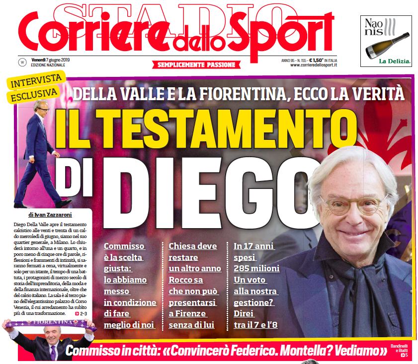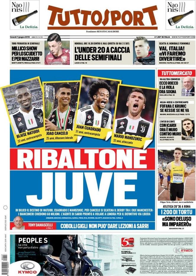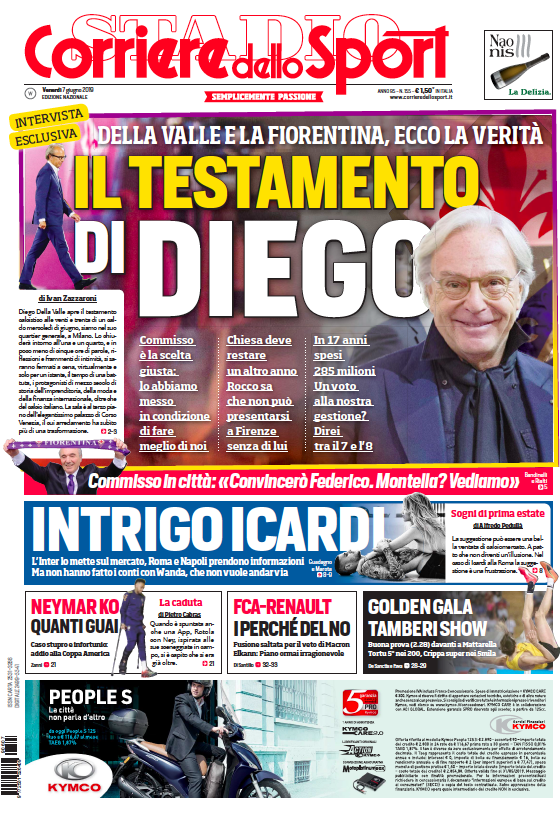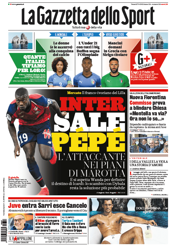 Le prime pagine di Gazzetta dello Sport e Tuttosport dedicano spazio all’inizio del Mondiale femminile di calcio in Francia, ma rilanciano anche sulla cessione della Fiorentina a Rocco Commisso e sul futuro di Icardi, che vorrebbe restare all’Inter. Maurizio Sarri sempre più vicino alla Juventus: l’allenatore ex Napoli ridisegnerà la fisionomia della formazione bianconera, dalla quale potrebbe essere in uscita Joao Cancelo e con lui altri nomi altisonanti di casa juventina.