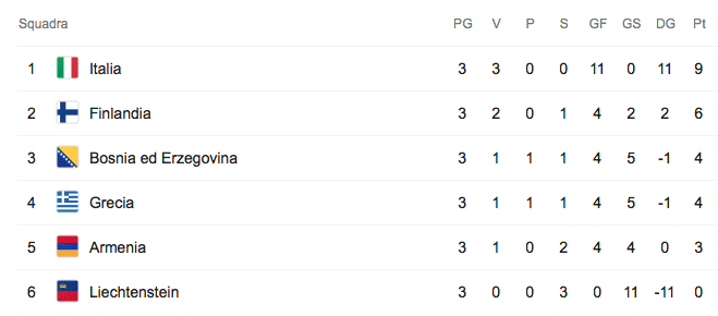 Martedì a Torino arriva la Bosnia-Erzegovina di Pjanic e Dzeko, ferma a quota 4 punti così come la Grecia, affondata in un tempo dall’Italia ed ora costretta a rincorrere per provare a non perdere terreno sulle prime due posizioni. La Finlandia, che si candida in piena regola come sorpresa finale del girone, ha steso i nostri prossimi avversari grazie alla doppietta di bomber Pukki. Di seguito la classifica del Girone J: