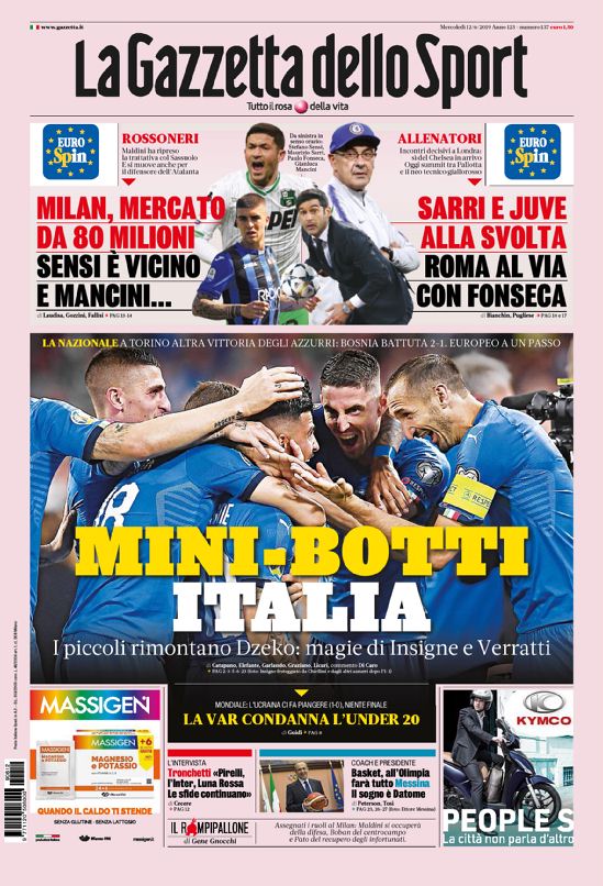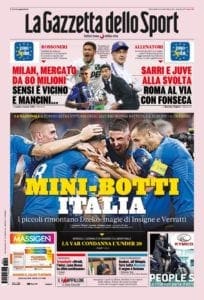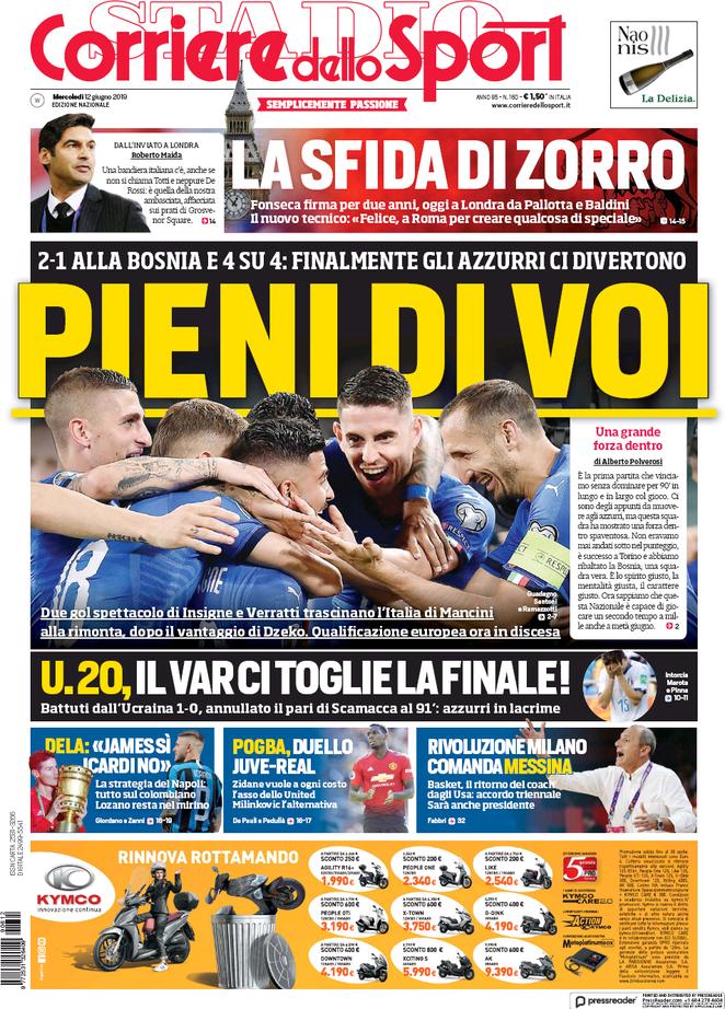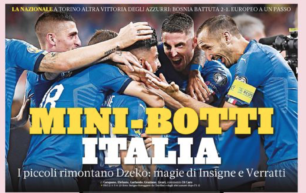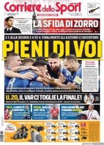 Le prime pagine dei quotidiani sono tutte per la vittoria in rimonta dell’Italia sulla Bosnia, risultato che vale il primato a punteggio pieno nel girone. De Laurentiis promuove l’acquisto di James Rodriguez ma raffredda la pista Icardi, che potrebbe finire alla Juventus in uno scambio con Dybala. I campioni d’Italia ci provano anche per Pogba, il Milan stanzia 80 milioni per il mercato mentre Kovacic è il prescelto per il centrocampo nerazzurro. Muriel verso l’Atalanta, Krunic sempre più accostato al Toro.