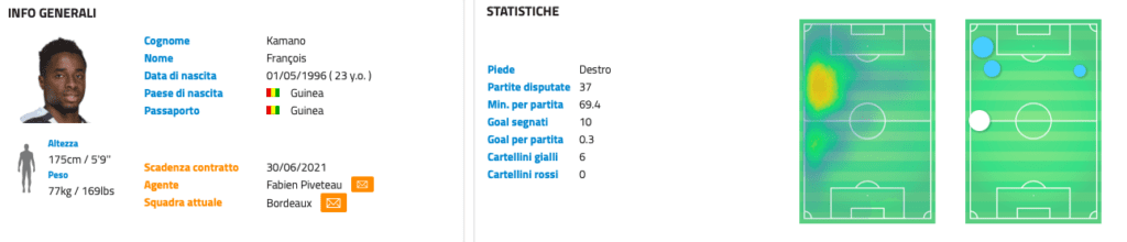 Di piede destro, 175 centimetri, il giocatore classe ’96 è seguito dall’agente Fabien Piveteau, che ha nella sua scuderia anche giocatori di altissimo profilo come Sadio Manè. Nell’ultima stagione ha disputato 40 partite con la maglia del club girondino (avversario del Genoa il 4 agosto prossimo, ndr) segnando 10 reti. In assoluto, ne ha disputate 177 in Ligue 1 con le maglie di Bastia e Bordeaux segnando 37 reti e fornendo 17 assist. Lo conosce bene l’ex compagno Lerager. Kamano è peraltro reduce dalla Coppa D’Africa giocato con la propria nazionale, competizione nella quale ha giocato quattro partite e segnato un gol.