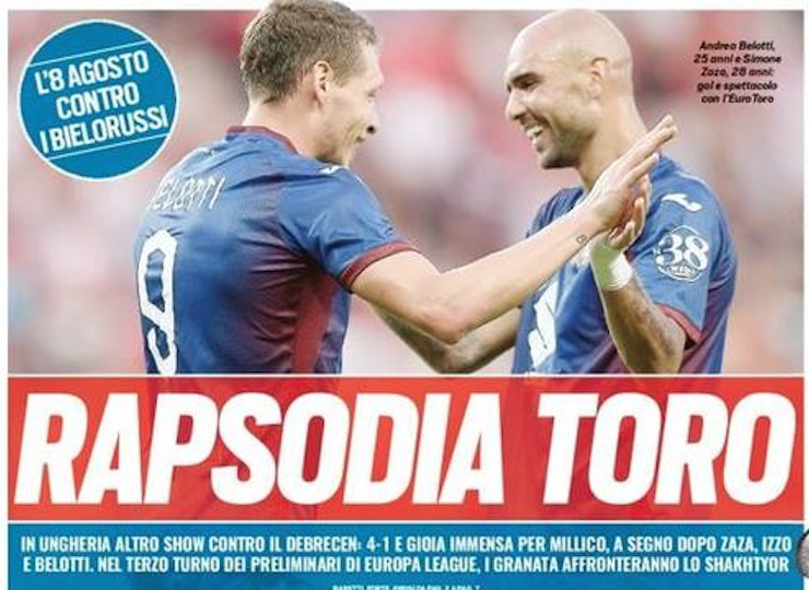 Il Torino passa il turno nei preliminari di Europa League e l’8 agosto sfiderà i bielorussi dello Shakhtyor. Dopo il 3-0 dell’andata, in Ungheria vanno a segno Belotti, Zaza, Izzo e il giovane Millico: “Rapsodia Toro” titola questa mattina Tuttosport.