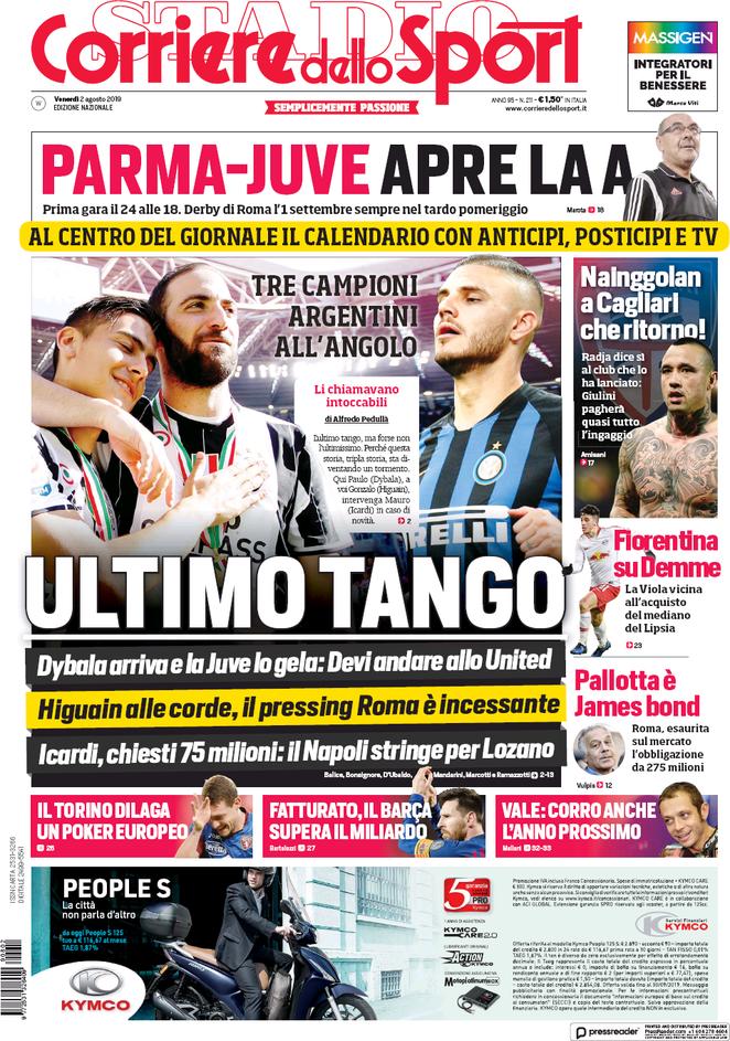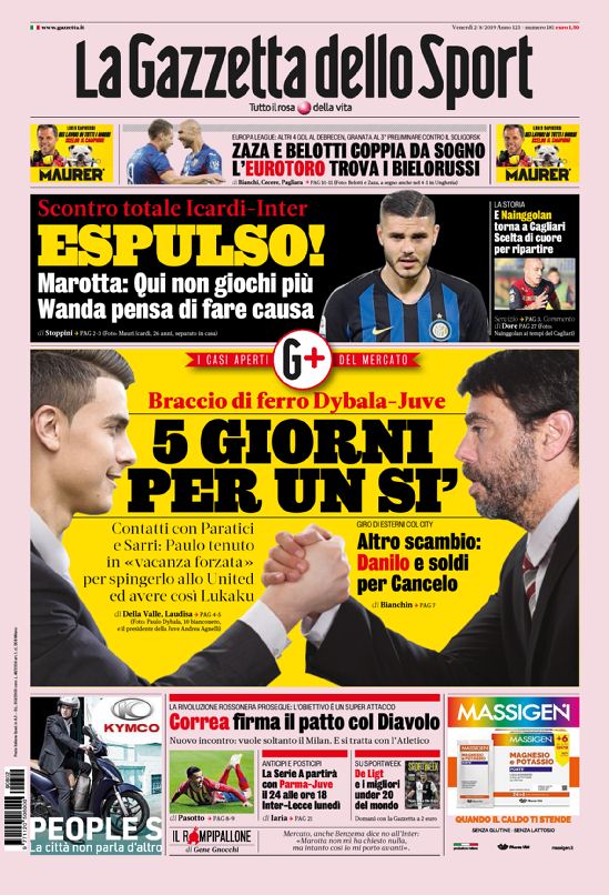 Calciomercato: la Juve forza l’addio di Dybala e studia uno scambio Cancelo-Danilo con il Manchester City di Guardiola. La Roma insiste per avere Higuaìn, il Milan ci crede ancora per Correa, l’Inter fissa il prezzo di Icardi (75 milioni) e ne conferma lo status di separato in casa: Wanda starebbe pensando ad un’azione legale per difendere il marito ed assistito. Il Napoli resta interessato all’attaccante argentino e prova a chiudere per Lozano.