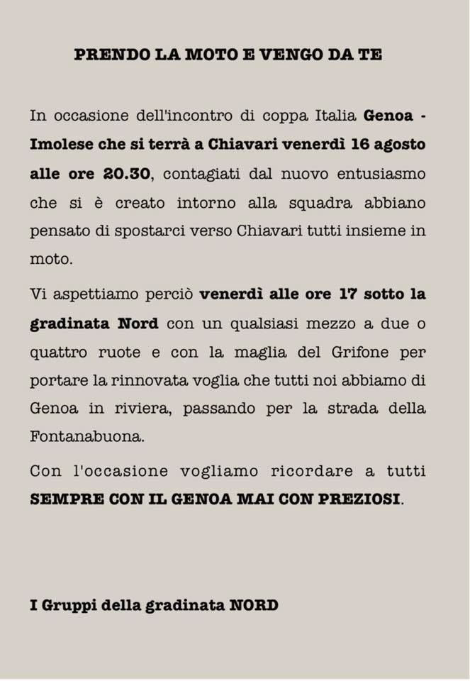 Per la gara tra Imolese e Genoa, valida per il terzo turno di Coppa Italia, è stato diramato pochi minuti fa un comunicato legato a come dirigersi in massa verso Chiavari. Si parla di un entusiasmo contagioso creatosi intorno alla squadra che ha portato a pensare di spostarsi verso Chiavari “tutti insieme in moto“.