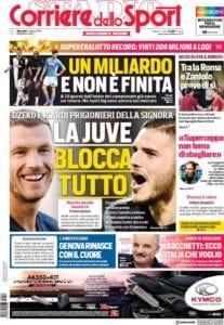 A un anno dal tragico crollo di Ponte Morandi a Genova, le prime pagine dei quotidiani sportivi si dividono fra la telenovela Mauro Icardi, le prime uscite di Lukaku con la maglia nerazzurra e le “prove d’amore” di Paulo Dybala con la Juventus. Il Milan ci prova ancora per Correa, l’Inter sonda Kostic e Kurzawa ma non molla neppure Dzeko. Questa sera va in scena la Supercoppa Europea fra Chelsea e Liverpool.