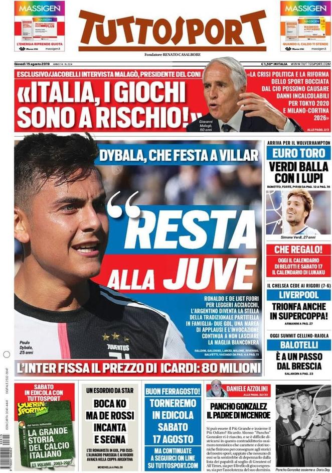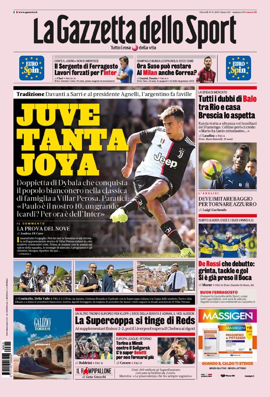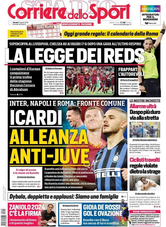 La sfida di Supercoppa Europea fra Liverpool e Chelsea viene portata a casa dai Reds solamente dal dischetto. A Pedro risponde Mané, poi supplementari e rigori incandescenti: errore decisivo di Tammy Abraham. Calciomercato: secondo il Corriere dello Sport il trio Inter-Roma-Napoli avrebbe indetto un’alleanza per evitare che Icardi possa vestire la maglia della Juventus nella prossima stagione. L’attaccante argentino sarebbe la prima scelta del Napoli, con Milik in giallorosso e Dzeko in nerazzurro da Conte. Dybala incanta in amichevole e sembra pronto a restare a Torino, dove i la controparte granata sfiderà nei preliminari di Europa League gli inglesi del Wolverhampton.