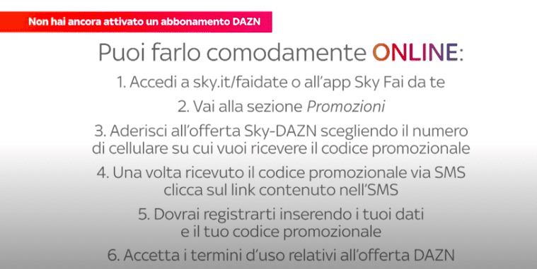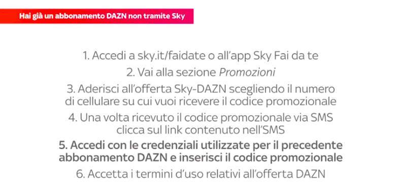 E se uno avesse sottoscritto un abbonamento DAZN senza passare da Sky? Ovviamente la procedura esiste anche per assicurare il nuovo servizio a chi avesse seguito questo percorso. Come spiega nuovamente Sky, ecco come procedere: