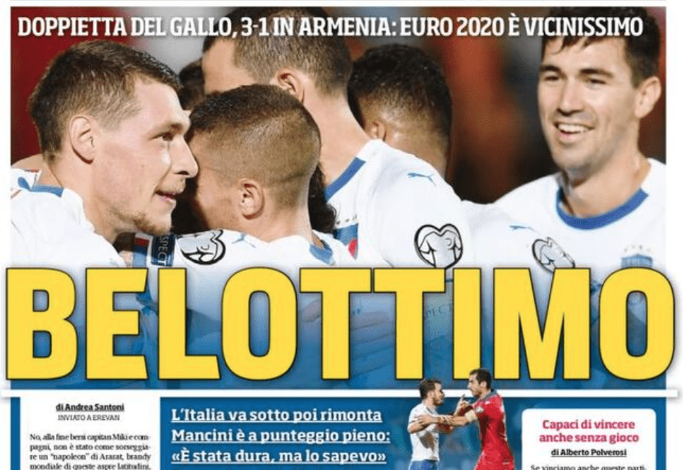 L’Italia vince in rimonta contro l’Armenia, rimane a punteggio pieno ed ampiamente in testa al girone di qualificazione ai prossimi campionati europei. Sarri tornerà contro la Fiorentina, affronta i malumori di Emre Can e non fa sconti nella “Juve dei troppi campioni”. Appello di Tuttosport a N’Koulou: “Devi fare pace con il Toro”. Wanda Nara su Icardi al PSG: “La scelta di Parigi è la peggiore per la mia famiglia”.