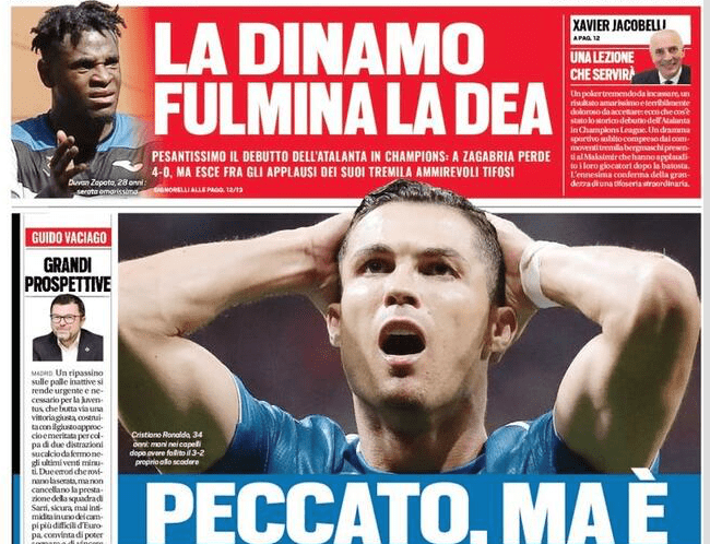 Atalanta “fulminata” dalla Dinamo Zagabria, Juventus beffata sul più bello dal “Magone Herrera”. Si sprecano i titoli e i giochi di parole nelle prime pagine dei quotidiani sportivi cartacei a poche ore dal 4-0 incassato dai nerazzurri di Gasperini e dal 2-2 fra bianconeri ed Atletico Madrid in Champions League. Questa sera torna l’Europa League, competizione nella quale l’Italia sarà rappresentata da Lazio e Roma: biancocelesti in campo alle 19 contro il Cluj, giallorossi in casa affrontano l’Istanbul Basaksehir.
