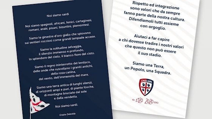 Cagliari-Genoa, in campo questa sera alle ore 20.45, aprirà la quarta giornata di campionato (clicca QUI per seguire la diretta testuale). In occasione dell’anticipo, visti i recenti episodi di discriminazione razziale, il Cagliari ha deciso di distribuire un opuscolo a tutti coloro che si recheranno alla “Sardegna Arena” per rimarcare il fatto che non sono tollerati comportamenti che possano essere accostati ad una condotta discriminatoria. Il volantino, da un lato, presenta le parole della poesia di Grazia Deledda “Noi siamo sardi”, dall’altro rimarca le linee guide della società che non vuole avere a che fare con chi attua comportamenti discriminatori, quindi non in linea con i valori dello stesso club rossoblu: “Rispetto ed integrazione sono valori che da sempre fanno parte della nostra cultura – si legge tra le righe – Difendiamoli tutti assieme con orgoglio, aiutaci a far capire a chi dovesse tradire i nostri valori che questo non può essere il suo stadio. Siamo una terra, un popolo”.