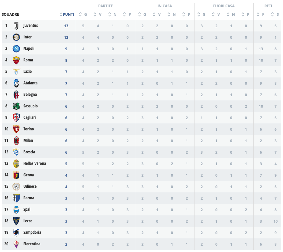LA CLASSIFICA AL TERMINE DEGLI ANTICIPI DELLA 5° GIORNATA