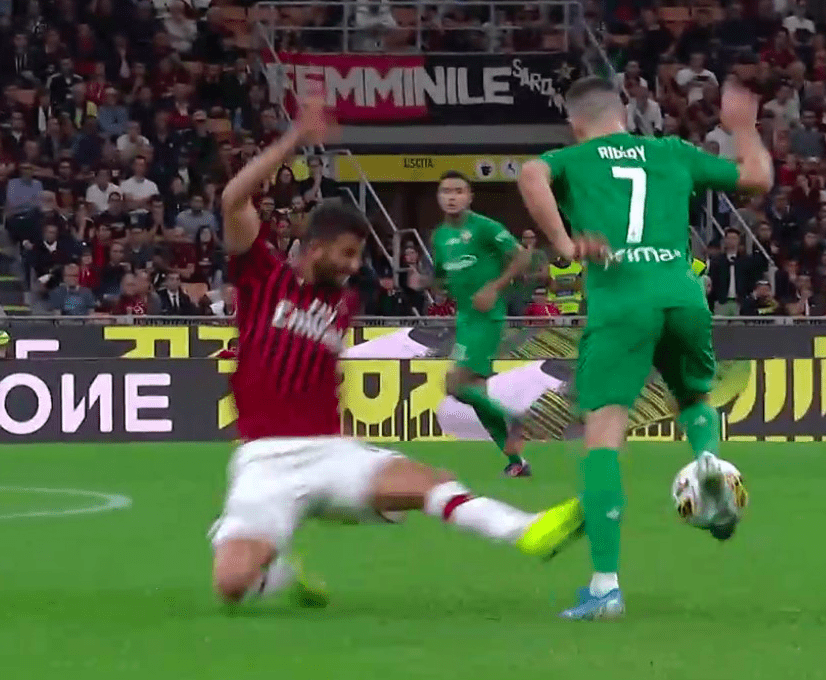 Oltretutto, come le immagini in movimento testimoniano, la gamba sinistra del numero 7 viola si piega in maniera pericolosa: l’incolumità di Ribery è stata messa a dura prova. Giacomelli non è vicinissimo all’azione e il VAR (Maresca) lo invita a commutare in rosso il cartellino giallo appena estratto. Sarà quello che accadrà dopo la on field review: il difensore rossonero, in attesa della ratifica ufficiale del Giudice Sportivo attesa nel pomeriggio, salterà la gara del Ferraris.