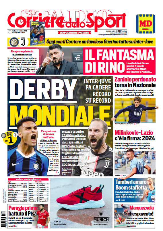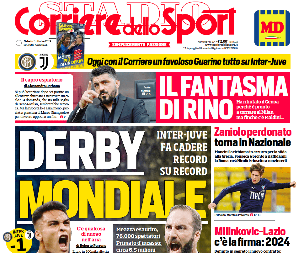 CORRIERE DELLO SPORT – Il Corriere dello Sport questa mattina avvicina la sfida tra Genoa e Milan a partire dalla prima pagina, dove si parla ancora del rifiuto di Gattuso al Genoa e del “fantasma di Rino”. Il tutto viene motivato come segue all’interno del quotidiano (riportiamo esattamente quanto scritto questa mattina sul giornale a pagina 2):