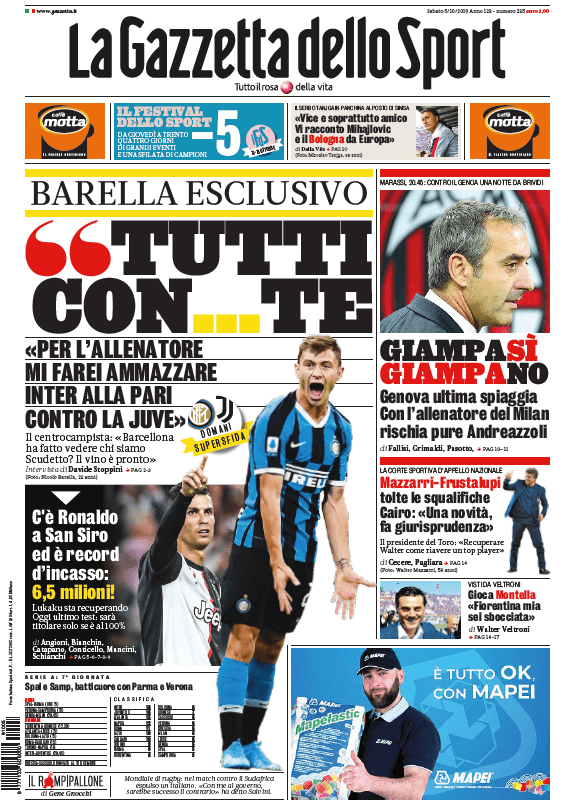 Perché a Eranio, come si legge a pagina 10, “spiace che Andreazzoli e Giampaolo si trovino in questa situazione, perché li stimo e continuo a pensare che siano gli allenatori giusti per i club che li hanno scelti. Preziosi mi ha sorpreso, non pensavo confermasse Andreazzoli dopo la brutta sconfitta con la Lazio, ma l’esperienza insegna: nel calcio ci vuole pazienza“. Sul fronte probabili formazioni, confermato il modulo 3-5-2 già proposto dal Corriere con Pajac a sinistra. Medesima formazione anche per il Milan.