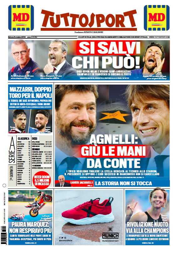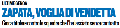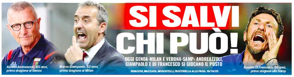 TUTTOSPORT – Infine arriviamo a Tuttosport, la cui probabile formazione del Genoa non cambia rispetto agli altri quotidiani sportivi, così come accade per i rossoneri. C’è spazio in prima pagina per un “si salvi chi può” con le tre facce di Andreazzoli, Giampaolo e Di Francesco, impegnato nella delicata sfida contro l’Hellas Verona (ore 18). Piccolo trafiletto dedicato a Cristian Zapata, difensore rossoblu che il Milan in estate ha lasciato senza contratto. Per lui, che viene dato per scontato partirà titolare, c’è voglia di vendicarsi.