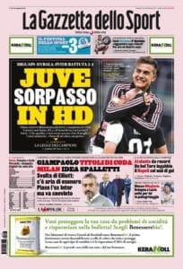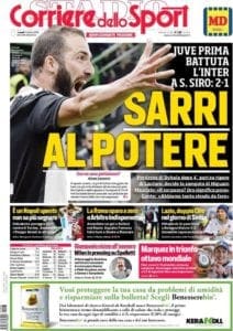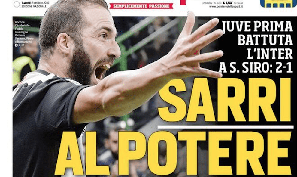La Juventus torna in testa al campionato battendo l’Inter a San Siro nel segno di Gonzalo Higuain: “Sarri al potere” titola la prima pagina del Corriere dello Sport. Il Napoli non sa più segnare, al Milan tira vento di svolta e si prova a convincere Spalletti per poter poi dare il benservito a Giampaolo, a Roma si grida allo scippo dopo il pareggio casalingo contro il Cagliari: espulsi Fonseca ed un collaboratore, infortuni per Dzeko e Diawara. L’Atalanta vince nel nuovo stadio e sigilla il record di punti e vittorie nel 2019.