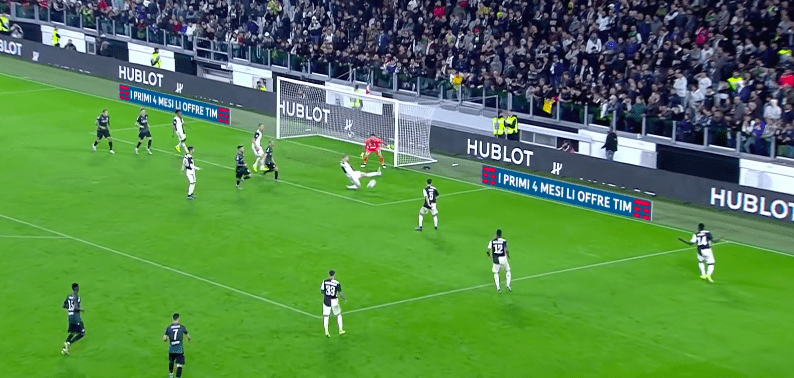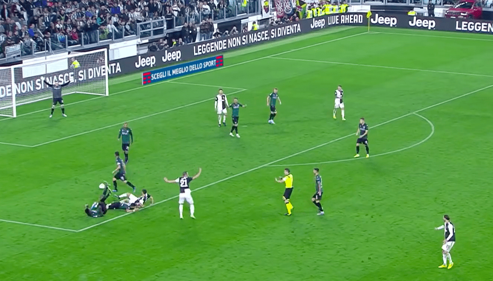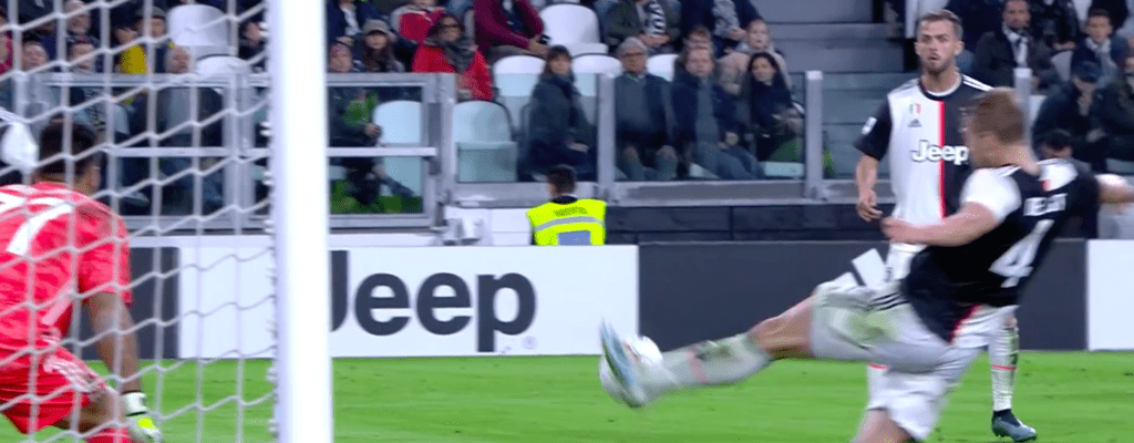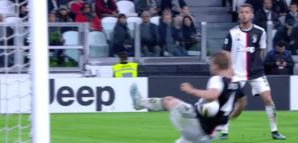C’è poi l’episodio chiave, quello che ha scomodato le moviole di tutta Italia, ed è riferito al tocco di mano di De Ligt. I concetti di giocata e deviazione si sprecano, ma è inevitabile ammettere che De Ligt cerca una deviazione e, muovendosi verso il pallone crossato da Skov Olsen, attiva una giocata: quella col braccio. Il pallone, a riguardare le immagini, sembra sfiorare lo scarpino destro del difensore: a quel punto, impattando solo dopo sul braccio sinistro, non sarebbe rigore. In realtà il vero dubbio è proprio se lo scarpino lo tocchi o meno visto che da una visuale frontale e da una retrospettiva le percezioni sono parecchio differenti.