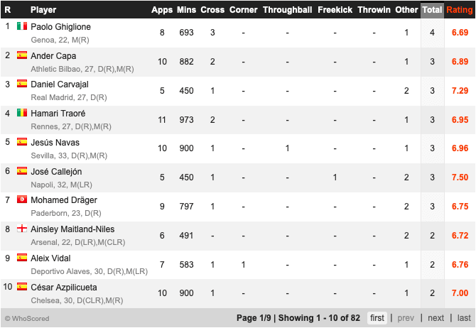Ma il dato che lo vede primeggiare è quello relativo ai soli giocatori che giocano nei ruoli di terzino oppure laterale di centrocampo. Restringendo il tiro, infatti, Ghiglione si ritrova al primo posto rappresentando una soluzione di continuità al predominio spagnolo. Unico a fornire almeno 4 assist ai proprio compagni in tutto il panorama dei cinque maggiori campionati europei, si lascia alle spalle terzini e laterali che rispondono al nome di Carvajal, Jesus Navas, Aleix Vidal, Azpilicueta e Callejon.