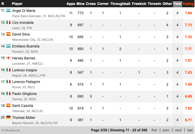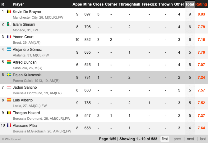 Al decimo posto nel panorama europeo generale coi suoi 4 assist, Ghiglione si inserisce in una classifica composta da nomi illustri: da De Bruyne al Papu Gomez, da Jadon Sancho a Thorgan Hazard. Il tutto passando per molti giocatori che militano in Serie A come Duncan, Kulusevski, Luis Alberto, Immobile, Insigne e Pellegrini.