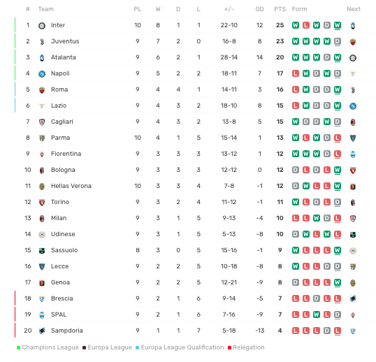 INTER TORNA AL COMANDO – I nerazzurri e Antonio Conte dicono “no” al turnover e si presentano alla trasferta di Brescia con lo schieramento migliore possibile. Il Brescia, dal canto suo, passa alla difesa a tre per care di creare problemi ai nerazzurri, con un centrocampo a cinque e la coppia d’attacco Donnarumma-Balotelli. L’Inter non è mai in controllo della gara, ma nel primo tempo la sblocca al 23′ con Lautaro Martinez, aiutato da una deviazione di Cistana che inganna Alfonso. Nel secondo tempo entra a spron battuto la formazione di Corini, che macina occasioni da gol e impatta sempre sulla difesa avversaria. Lukaku, nel momento migliore degli avversari, porta la gara sul 2-0 quando il cronometro indica il 63esimo. Dopo aver gestito male almeno un paio di ripartenza per chiudere la gara, il Brescia torna meritatamente in partita con Bisoli, bravo a inserirsi trovando la deviazione di Skriniar che varrà l’autogol. Ma dall’1-2 finale non ci schioderà più: l’Inter torna in vetta in attesa della Juventus, domani sera impegnata contro il Genoa. Brescia rimane al terzultimo posto in attesa delle gare di Spal e Sampdoria.